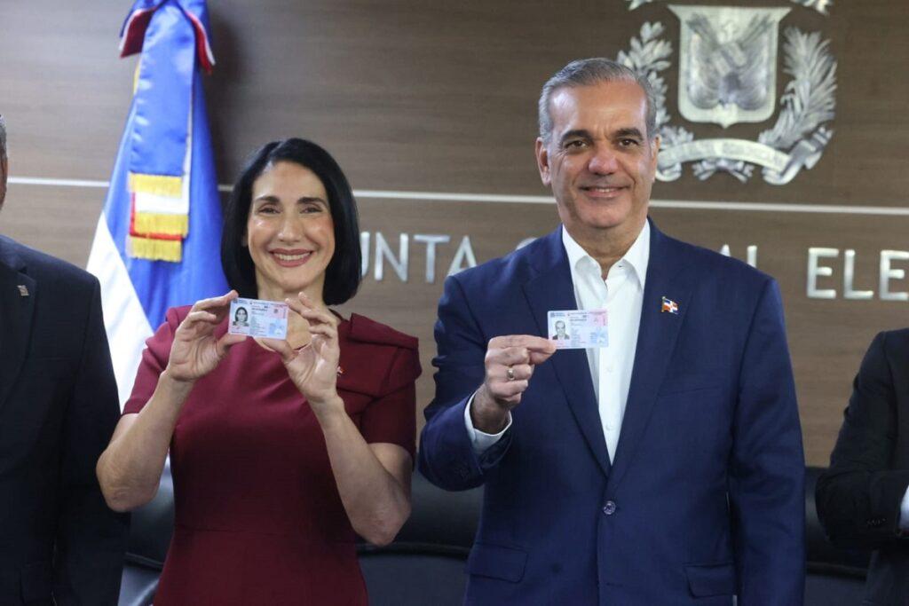 El presidente Luis Abinader, acompañado de la primera dama Raquel Arbaje, recibió en sus manos el plástico elaborado con materiales de policarbonato y grabado en láser para garantizar la protección de los datos.