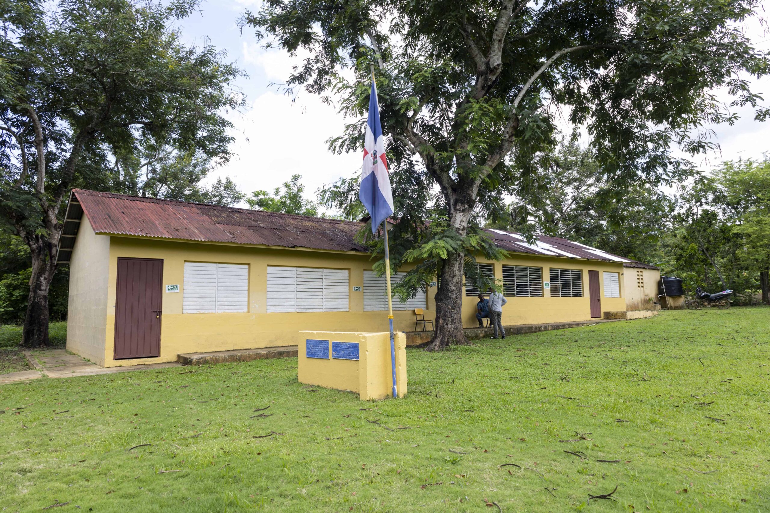 El plantel de dos aulas conserva la tarja que le colocaron en la entrada cuando se inauguró, en el gobierno de Antonio Guzmán (1978-1982), como testigo de un pasado en el que se quedó paralizada y en el que era natural que un presidente entregara una escuela con letrinas para docentes y estudiantes. Esas letrinas aún están en uso.