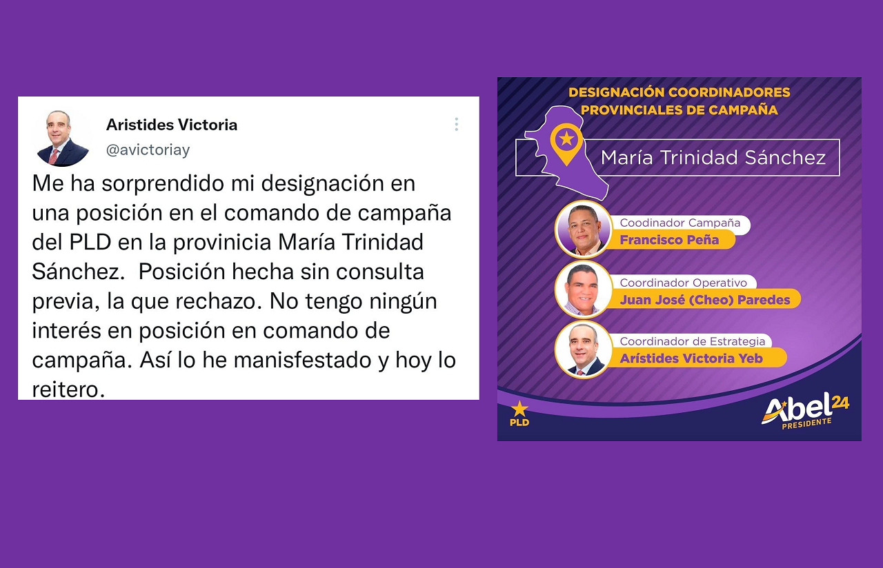 El exsenador de la provincia y ex miembro del PLD Aristides Victoria publicó en su cuenta de twitter que ha sido sorprendido por su designación en una posición en el comando de campaña, que fue realizada sin consultarle y que rechaza. Reiterando no tener interés en pertenecer al comando de campaña del candidato presidencial de ese partido Abel Martinez.