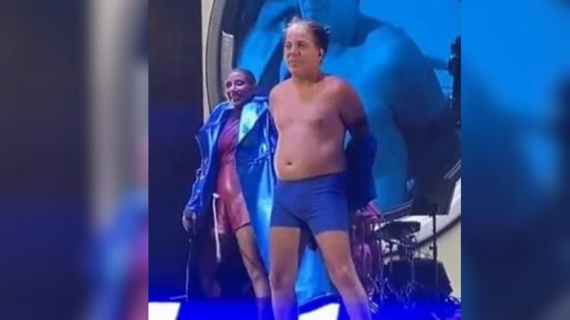 Tal como muestran las imágenes Castro subió a tarima con un ajustado conjunto azul de pantalón corto y jacket mangas largas, el cual se quitó frente al público.