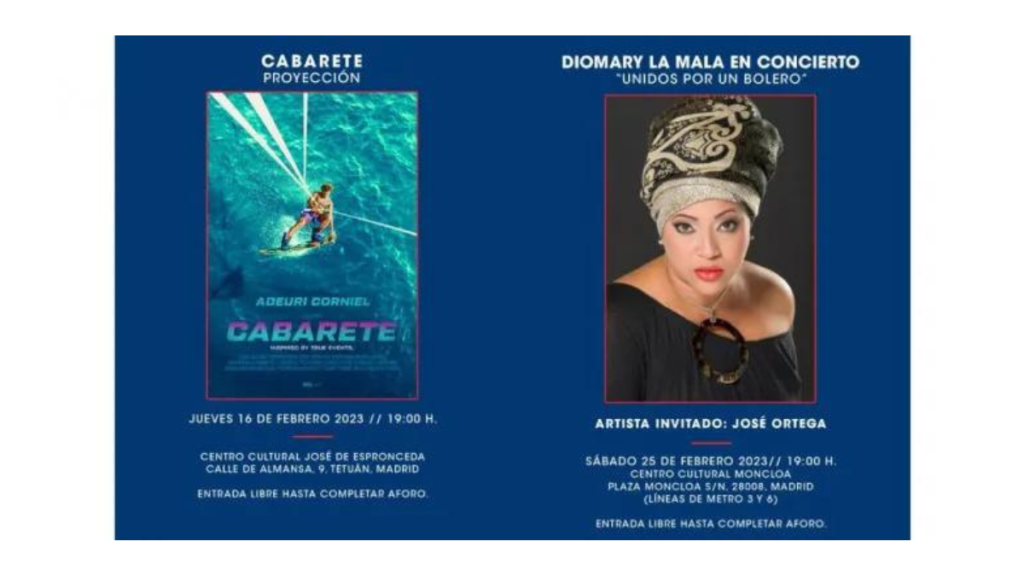 El sábado 25 de febrero celebraremos la Gran Fiesta Nacional con el concierto de la cantante dominicana Diomary La Mala, quien interpretará los temas musicales más emblemáticos del cancionero dominicano. El encuentro está pautado para las 19 h. en el Centro Cultural Moncloa, ubicado en la plaza Moncloa, s/n. La entrada es libre hasta completar aforo, tanto al concierto como a la proyección del filme y a la conferencia.