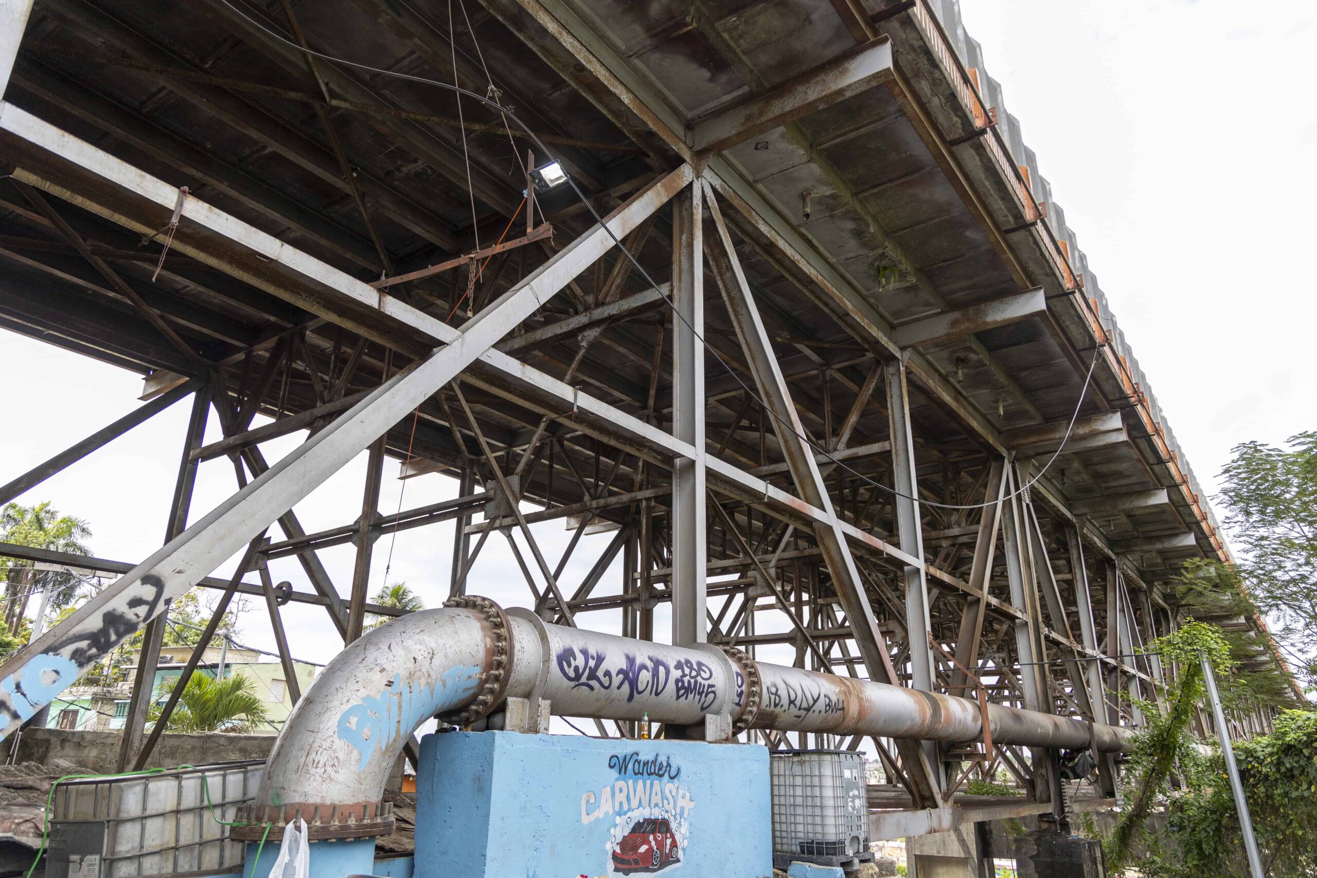 En la cabecera norte, en la ribera del Ozama, se soldaron dos parches a una tubería que afectaba la estructura desde hacía años. Aunque se corrigió esa filtración, otra fuga cercana aún no ha sido atendida.
