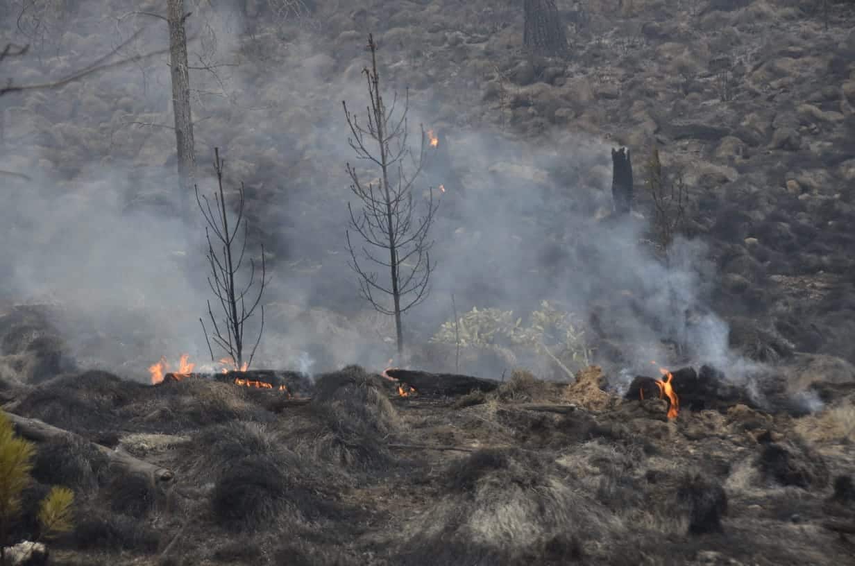 Mientras, para sofocar el fuego, los socorristas utilizan machetes, con los que abren trochas para detener las llamas, que afectan el área boscosa compuesta en gran magnitud por pinos.