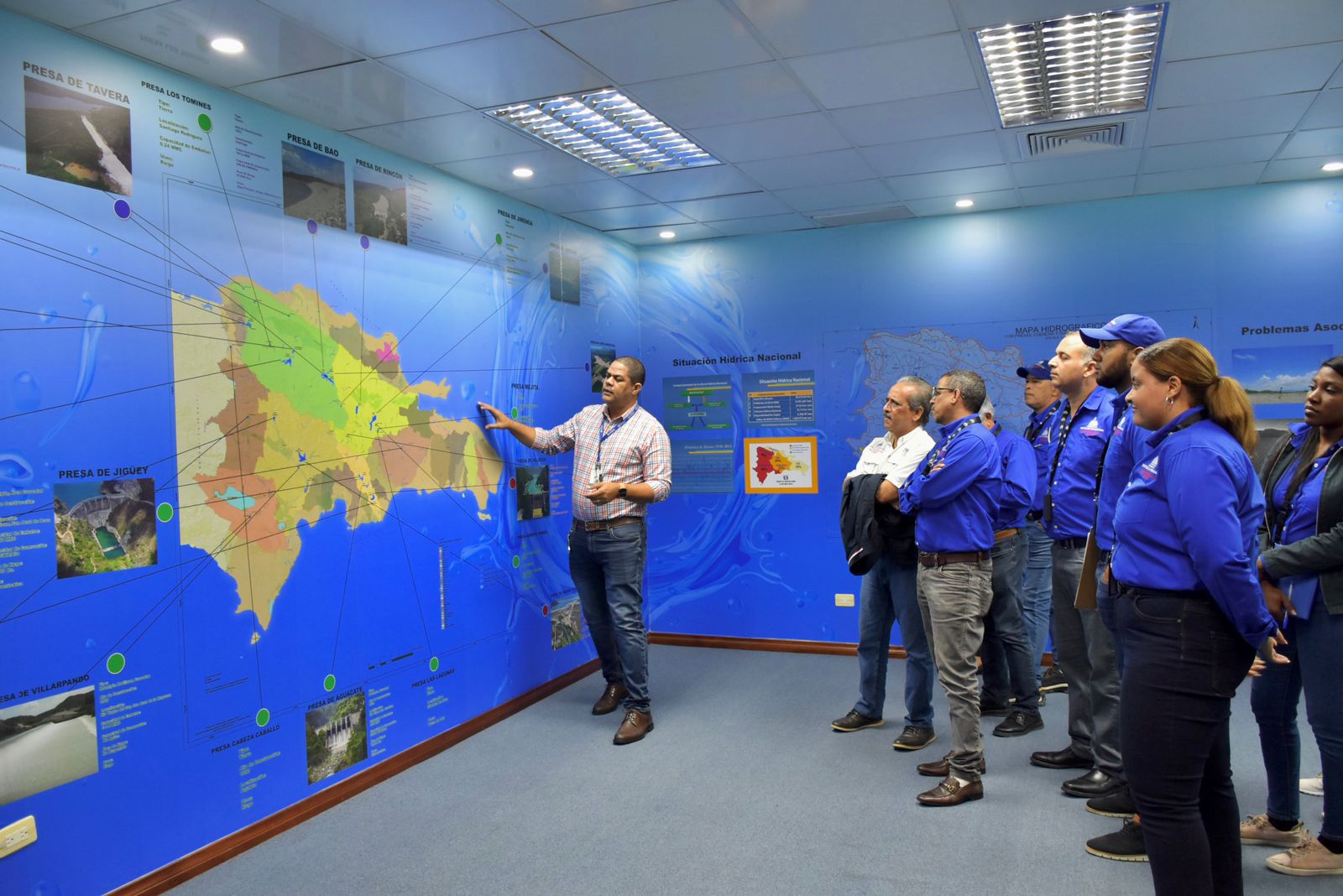 Santo Domingo. -La Sala del Agua del Instituto Nacional de Recursos Hidráulicos (INDRHI) contó con la presencia de directivos de Tecnificación Nacional de Riego (TNR), encabezado por su director ejecutivo, Claudio Caamaño Vélez, quienes recorrieron el área con la finalidad de expandir conocimientos sobre la concepción del agua, el uso adecuado de este preciado líquido y dominar datos macros sobre la situación hídrica a nivel nacional.