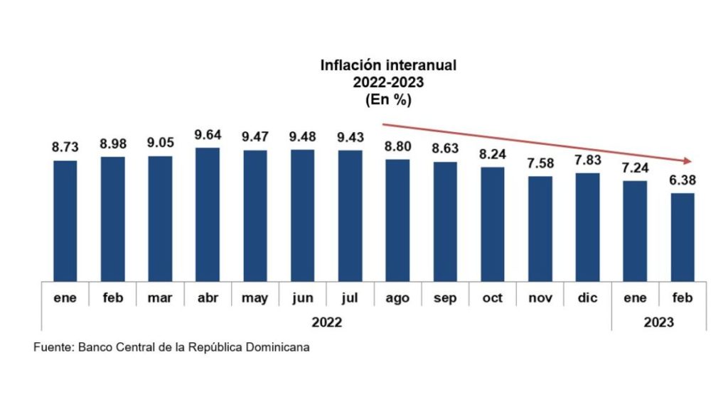 Santo Domingo. -El Banco Central de la República Dominicana (BCRD) informó hoy que la variación mensual del Índice de Precios al Consumidor (IPC) fue de 0.11 % en febrero del 2023. En este sentido, la inflación interanual, es decir de los últimos 12 meses, bajó 86 puntos básicos al pasar de 7.24 % en enero del 2023 a 6.38 % en febrero del presente año.