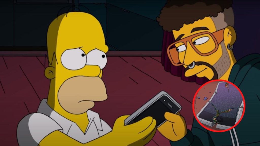 "Homero" entrega su celular a Bad Bunny, quien toma el dispositivo, lo tira al suelo y lo pisa hasta romperlo, para que pase más tiempo con su familia. Una escena que, según los fanáticos, se revivió en los últimos días, cuando el cantante lanzó el teléfono de una admiradora al mar.
