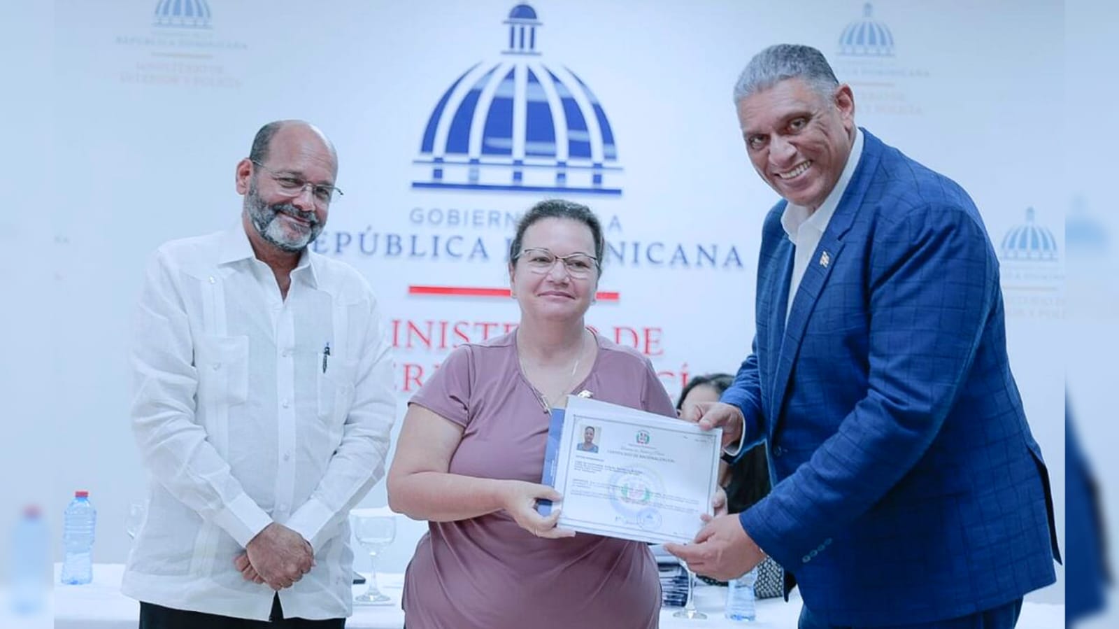 El director de Naturalización del Ministerio de Interior y Policía, Benito Vidal, y la directora de Gestión Migratoria, Laura Mariñez acompañaron a Vásquez Martínez durante el acto de juramentación.