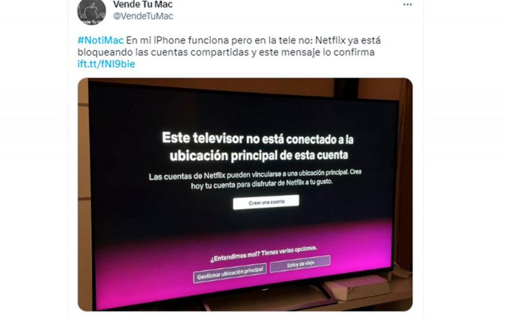 “Este televisor no está conectado a la ubicación principal de esta cuenta”, reza el mensaje que aparece al entrar a Netflix mediante una televisión con la ubicación principal establecida en otro hogar. La opción pasa por crear una cuenta para poder continuar disfrutando del servicio. No obstante, el aviso también ofrece la posibilidad de ‘Gestionar la ubicación principal’ e incluso marcar la opción ‘Estoy de viaje’.