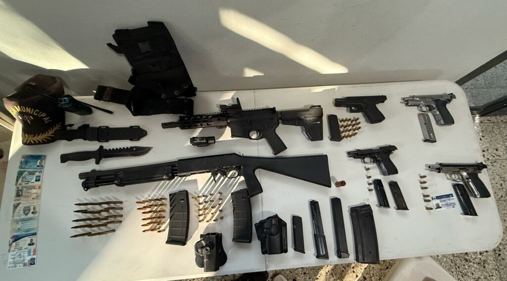 Un fusil marca Palmette PA 15 Multi más dos cargadores, 76 municiones 5.56 milímetros, 1 escopeta marca Valtro, calibre 12, 1 pistola Glock 19 calibre 9 milímetros con tres cargadores, 18 municiones calibre 9 milímetros, 1 cargador de 30 para pistola Tauro, 1 foco para Glock, 2 cananas, 1 pistola marca S & W calibre 9 milímetros, 1 pistola marca Tanfoglio 9 milímetros con su cargador y 6 municiones, 1 pistola marca P. Beretta calibre 380 milímetros con dos cargadores y 4 cápsulas.