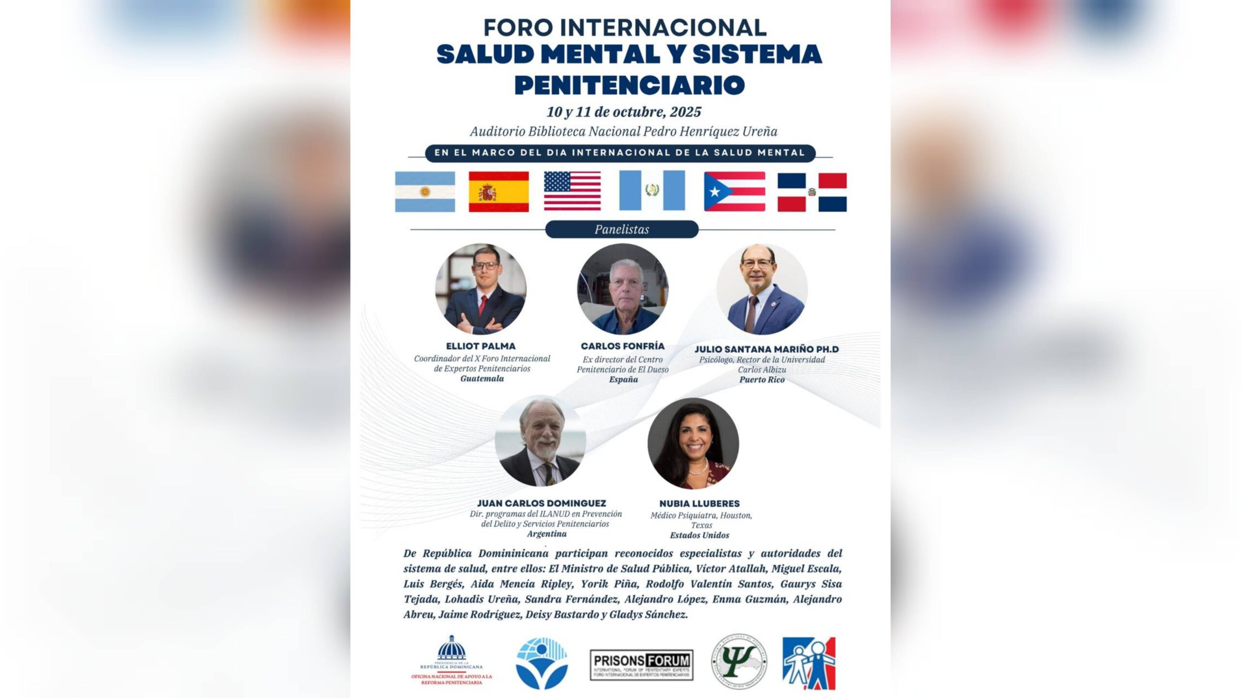 De República Dominicana participarán reconocidos especialistas y autoridades del sistema de salud y del ámbito penitenciario, entre ellos el Ministro de Salud Pública, así como Víctor Atallah, Miguel Escala, Luis Bergés, Aida Mencia Ripley, Yorik Piña, Rodolfo Valentín Santos, Gaurys Sisa Tejada, Lohaidis Ureña, Sandra Fernández, Alejandro López, Enma Guzmán, Alejandro Abreu, Jaime Rodríguez, Deisy Bastardo y Gladys Sánchez.