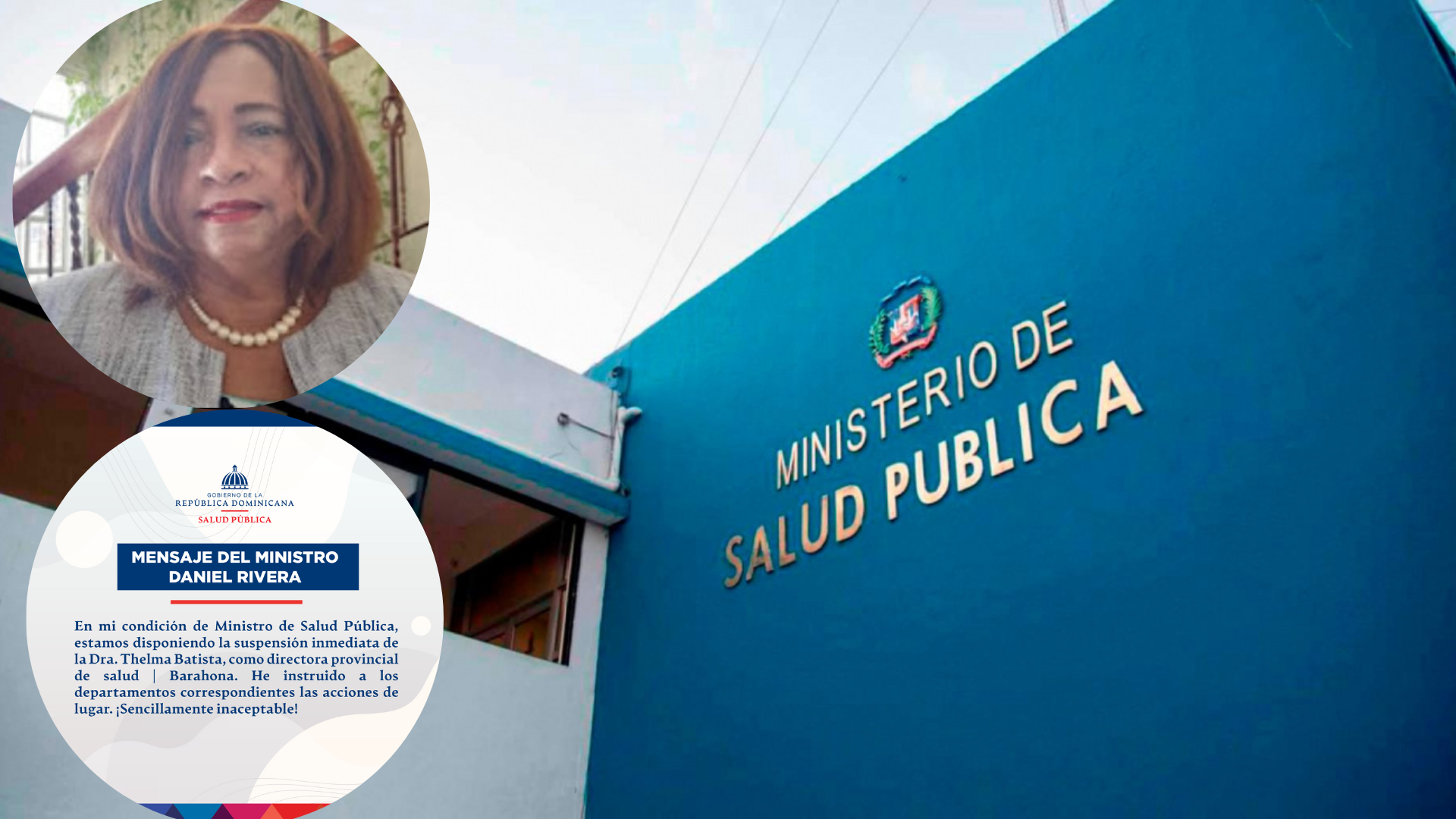 Santo El ministro de Salud Pública, Daniel Rivera, dispuso la noche de este domingo "la suspensión inmediata" de la doctora Thelma Batista como directora provincial de Salud en la provincia Barahona.