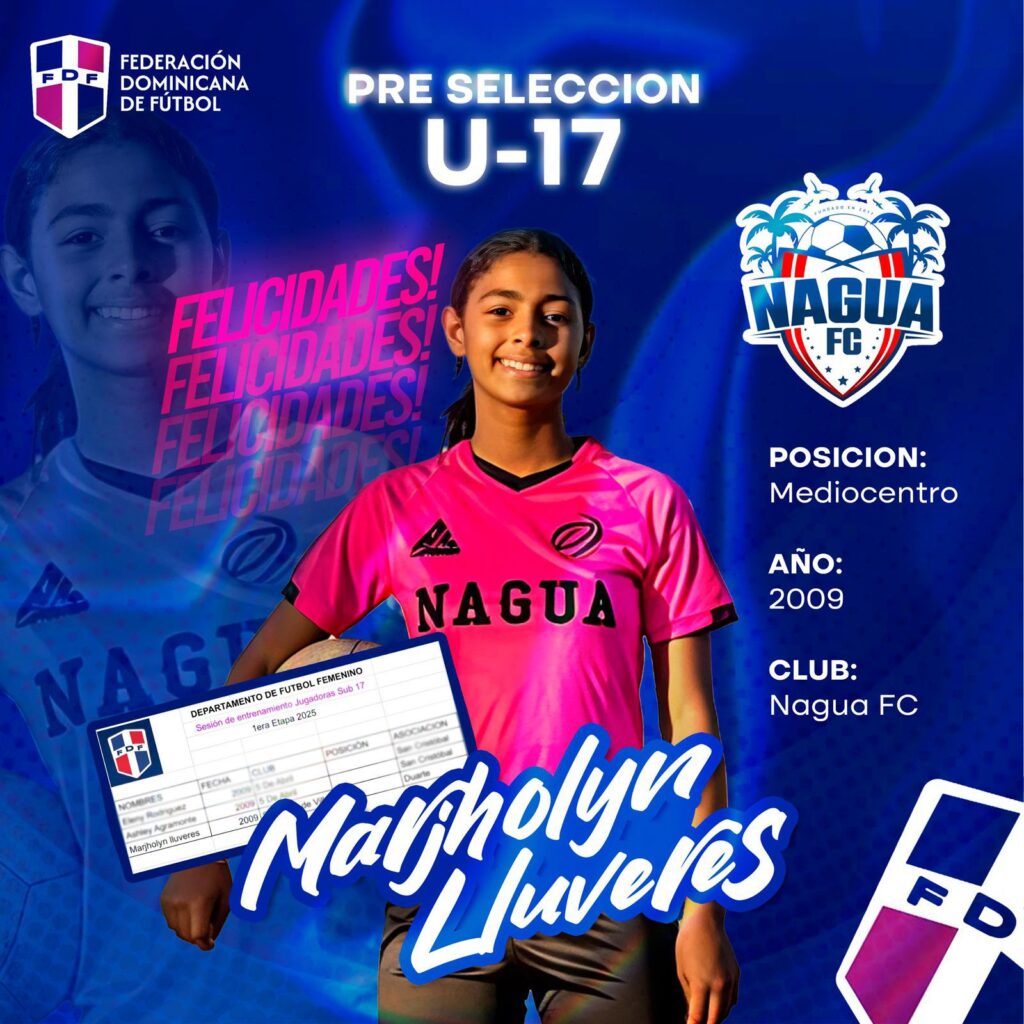 La joven y talentosa jugadora Marjholyn Luveres, mediocentro del club Nagua FC, ha sido preseleccionada por la Federación Dominicana de Fútbol para integrarse a los entrenamientos de la Selección Nacional Femenina Sub-17, con miras al próximo Mundial Sub-17 que se celebrará en Inglaterra.